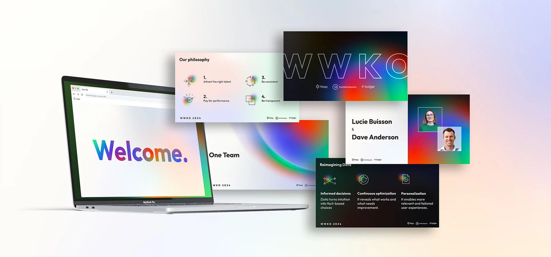 The World Wide Kickoff is the annual team building event of the Contentsquare company. For this event I had to design a particular brand, reflecting the merge of Contentsquare with Heap and Hotjar. I used the 3 main colors of the 3 companies and merged them into a futuristic gradient to broadcast the future of the brands.